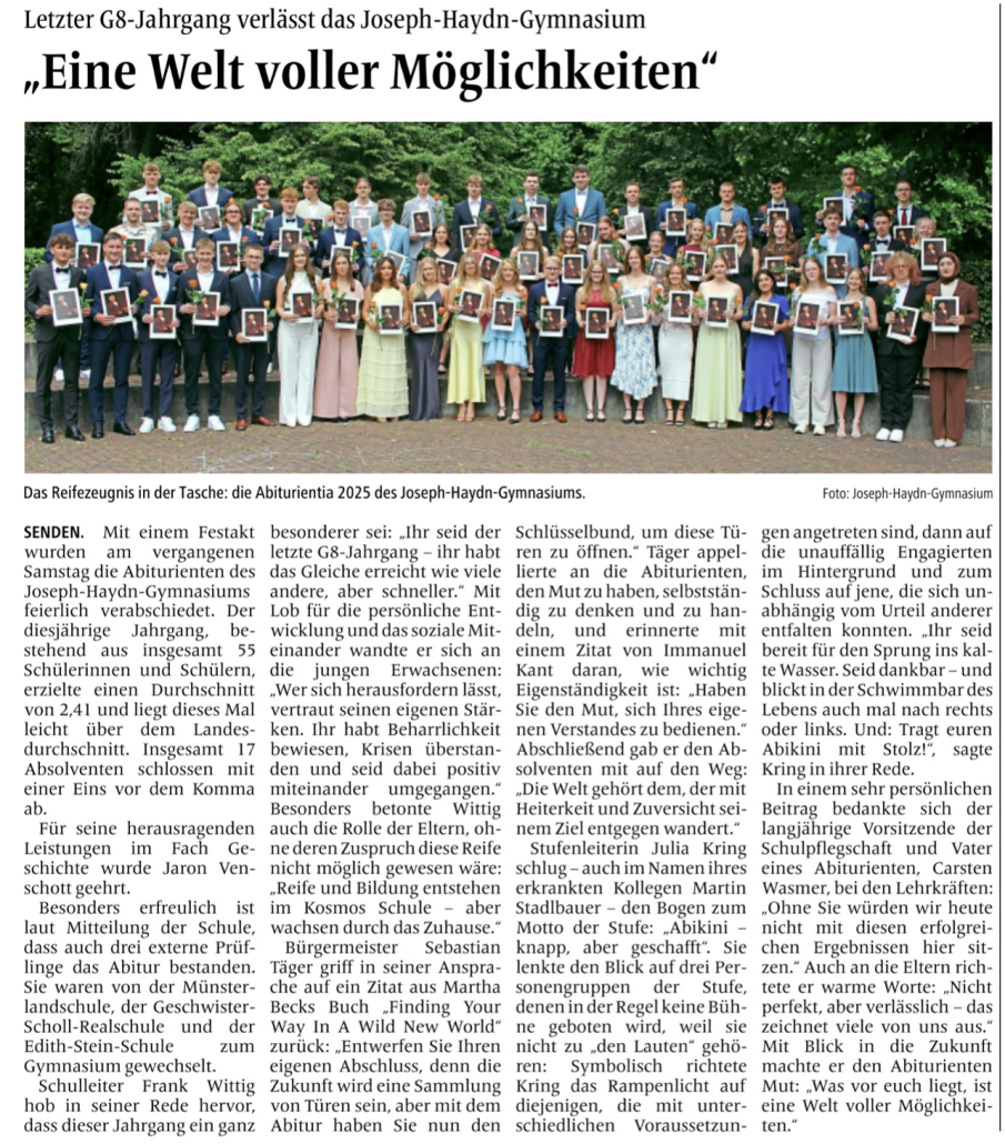 WN vom 08.07.2025: „Eine Welt voller Möglichkeiten“ – Letzter G8-Jahrgang verlässt das Joseph-Haydn-Gymnasium