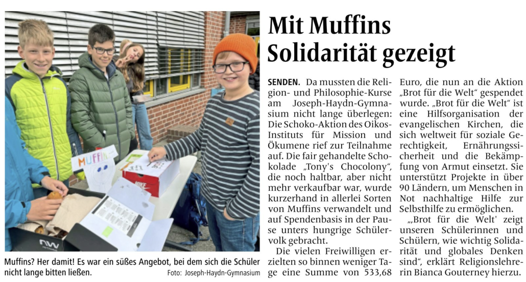 SENDEN. Da mussten die Religion- und Philosophie-Kurse am Joseph-Haydn-Gymnasium nicht lange überlegen: Die Schoko-Aktion des Oikos-Instituts für Mission und Ökumene rief zur Teilnahme auf. Die fair gehandelte Schokolade „Tony’s Chocolony“, die noch haltbar, aber nicht mehr verkaufbar war, wurde kurzerhand in allerlei Sorten von Muffins verwandelt und auf Spendenbasis in der Pause unters hungrige Schülervolk gebracht.