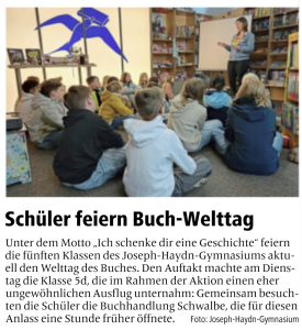 Unter dem Motto „Ich schenke dir eine Geschichte“ feiern die fünften Klassen des Joseph-Haydn-Gymnasiums aktuell den Welttag des Buches. Den Auftakt machte am Dienstag die Klasse 5d, die im Rahmen der Aktion einen eher ungewöhnlichen Ausflug unternahm: Gemeinsam besuchten die Schüler die Buchhandlung Schwalbe, die für diesen Anlass eine Stunde früher öffnete.