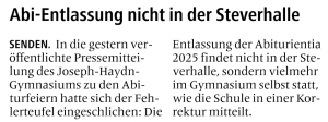 WN vom 02.07.2025:Abi-Entlassung nicht in der Steverhalle